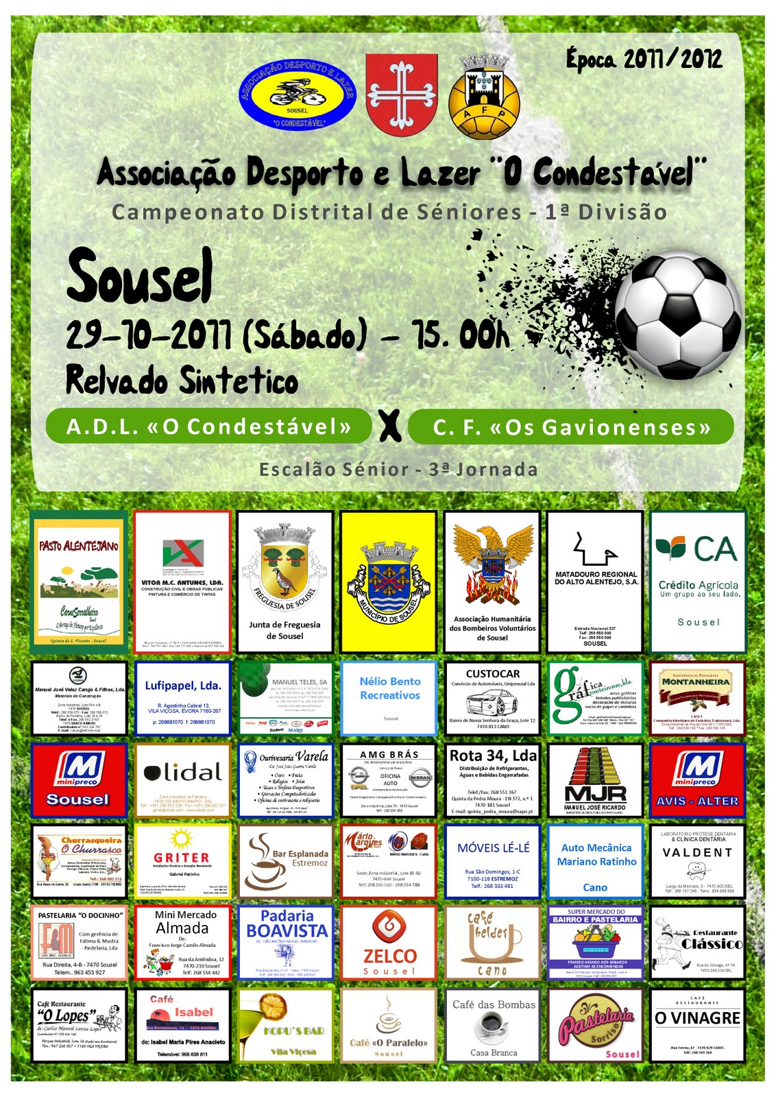 Domingo 16-10-2011 pelas 15:00 no Campo Municipal de Sousel, a equipa sénior do ADL "O Condestável vai defrontar o G.D. Alegrete a contar para a 1º Divisão Distrital de Portalegre.